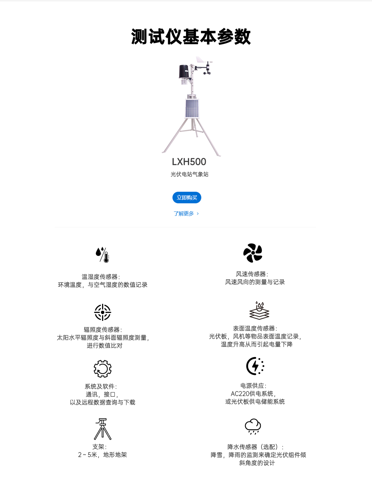 氣象站是萊科斯一套關(guān)于太陽能測(cè)量數(shù)據(jù)采集的系統(tǒng),應(yīng)用與光伏發(fā)電,光熱電站,風(fēng)力發(fā)電領(lǐng)域的氣象監(jiān)測(cè),整套設(shè)計(jì)符合CAISO標(biāo)準(zhǔn),適用于資源評(píng)估與電力監(jiān)測(cè)。