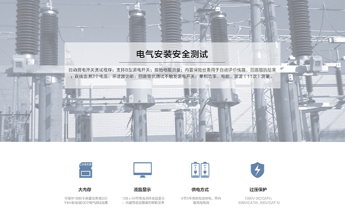絕緣電阻;PE導(dǎo)線連續(xù)性;線路阻抗;回路阻抗(不觸發(fā)漏電開(kāi)關(guān));RCD漏電開(kāi)關(guān)測(cè)試(AC、A、B型);接地電阻測(cè)試;交流電流測(cè)試(負(fù)載電流或泄漏電流);電壓、頻率、相序測(cè)試;功率、電能、諧波測(cè)試。