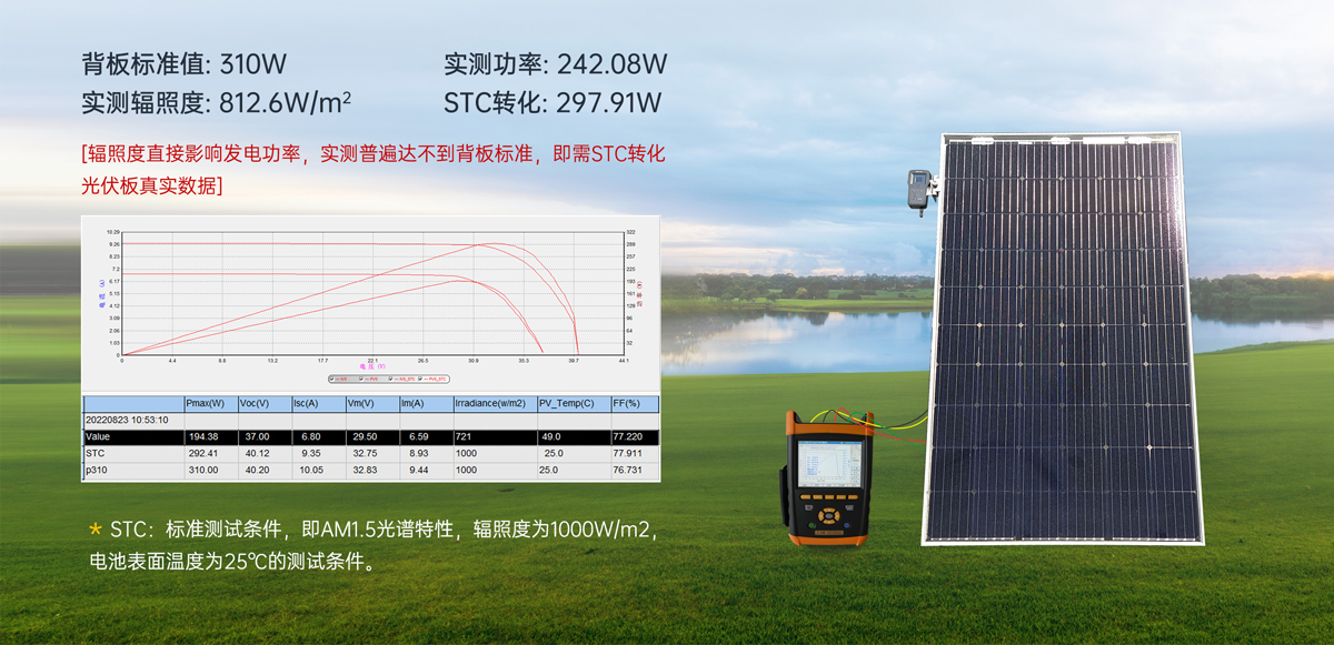 注***:光伏組件功率測試儀-PV30轉(zhuǎn)換到STC下最大功率準確性指標是在穩(wěn)定輻照度≥700W/m2,光譜滿足AM1.5條件下測得。在實驗室條件下該指標一般在2%以內(nèi)。現(xiàn)場測試時,請在太陽光照穩(wěn)定條件下測試,并確保輻照度探頭與溫度探頭安裝可靠,否則會因為輻照度測試偏差及溫度偏差照成較大的轉(zhuǎn)換誤差。